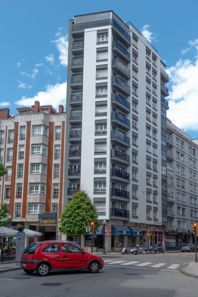 El edificio rehabilitado, situado en la C/Campomanes 20 de Oviedo, data de año 1959. La obra de rehabilitación energética ha consistido en la ejecución de una envolvente térmica mediante un sistema de Fachada Ventilada con revestimiento combinado de gres porcelánico y composite en fachadas principales y SATE en fachada posterior y patios.