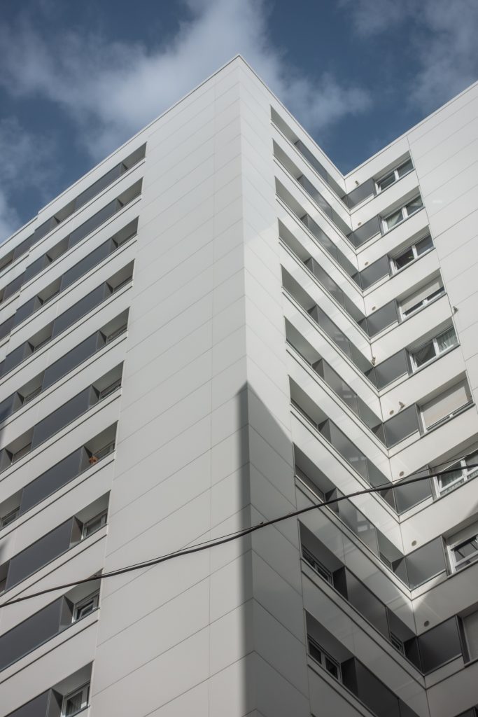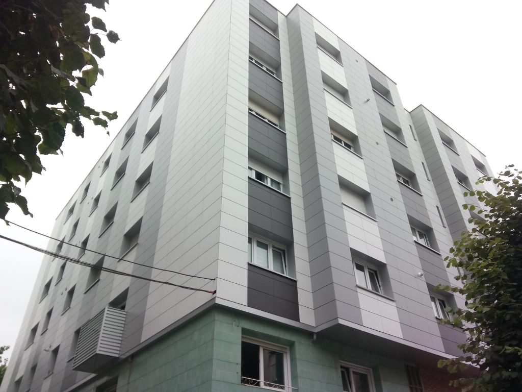 La solución que se ha llevado a cabo en este edificio es revestir las fachadas principales con un sistema de fachada ventilada y un revestimiento con sistema SATE en la medianera.