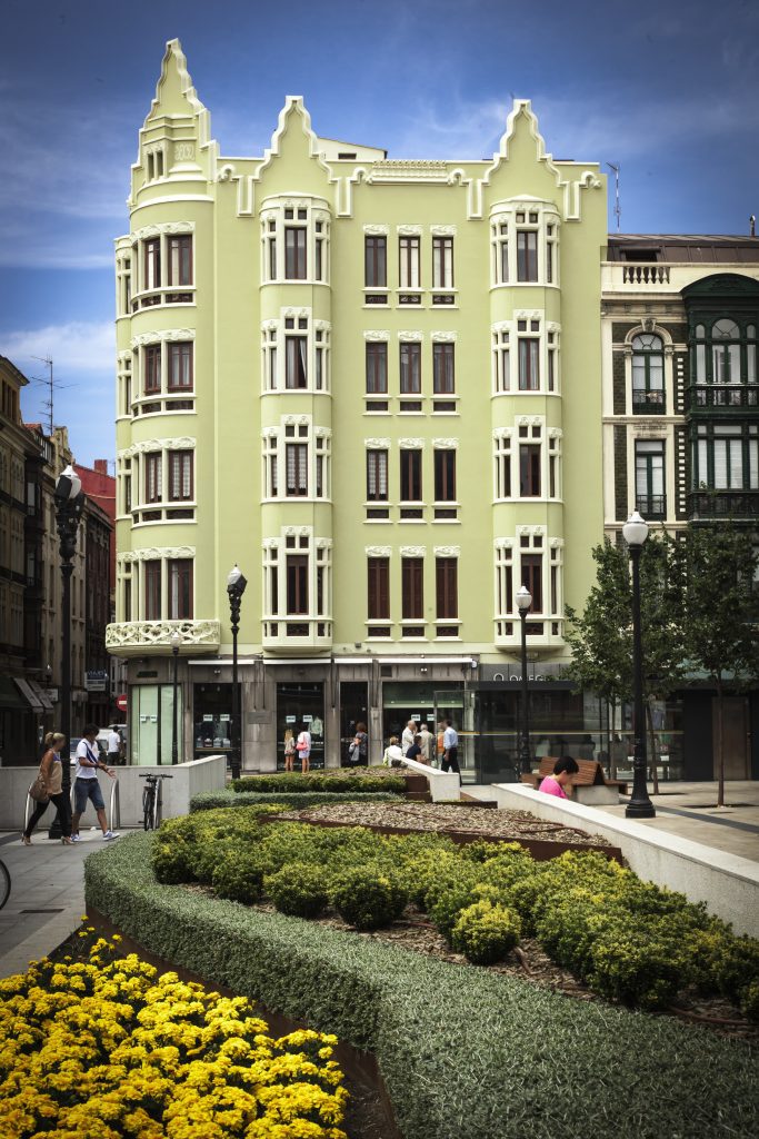 Restauración de fachadas de edificio modernista en la calle La Merced 27 (Gijón)