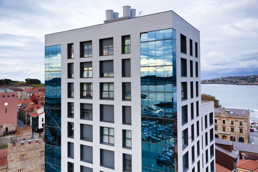 Edificio residencial de Gijón que ha mejorado notablemente su aislamiento térmico de fachada.