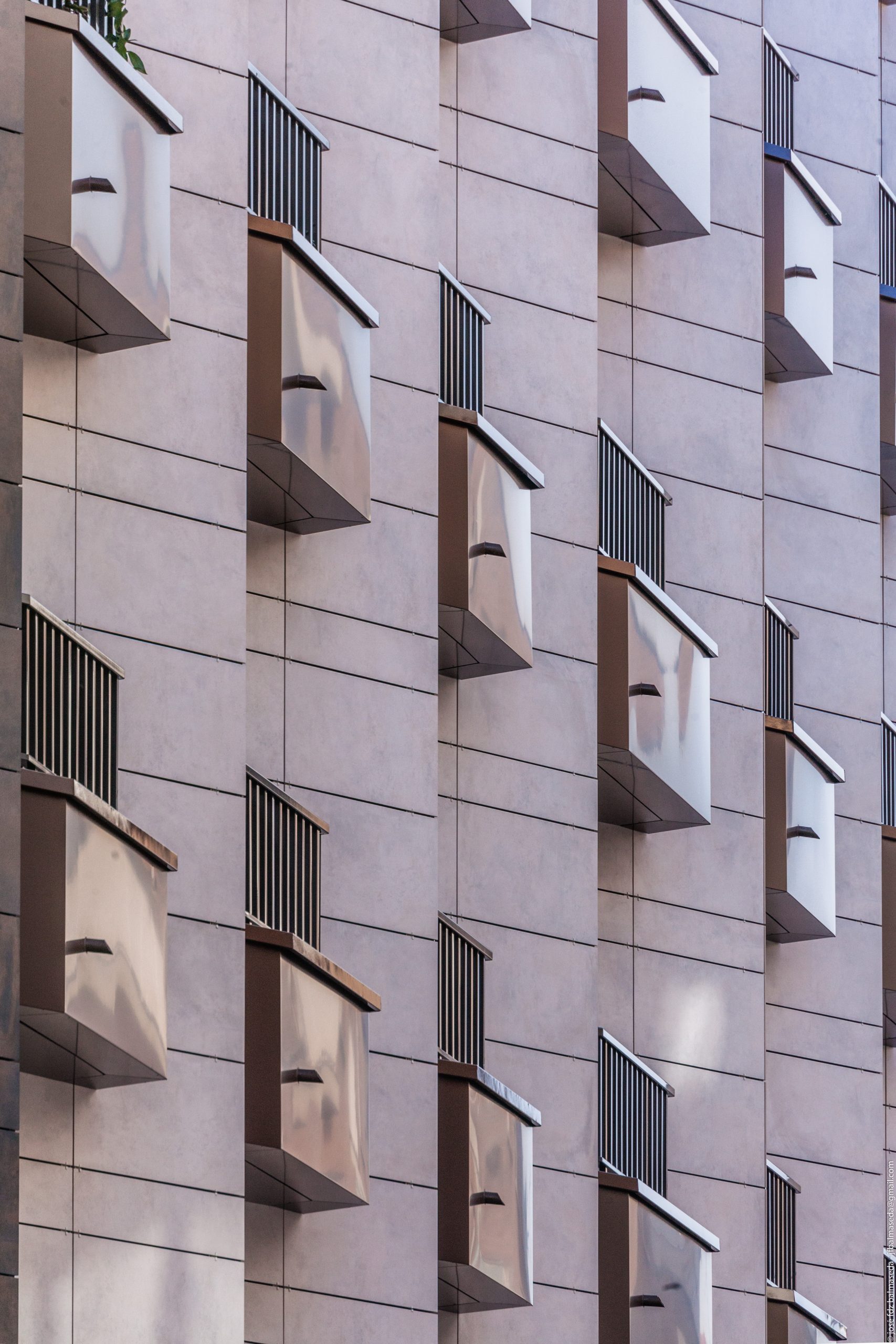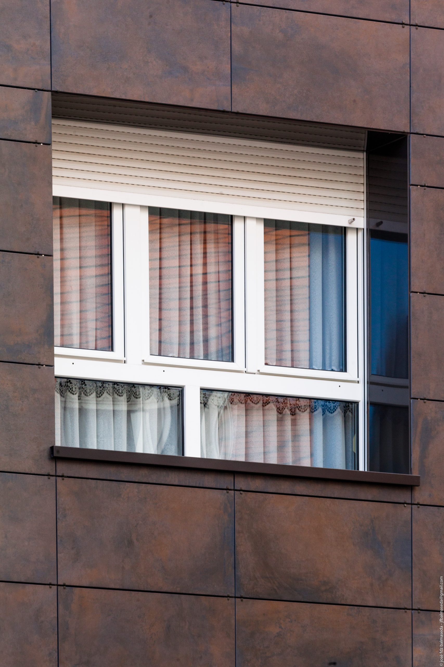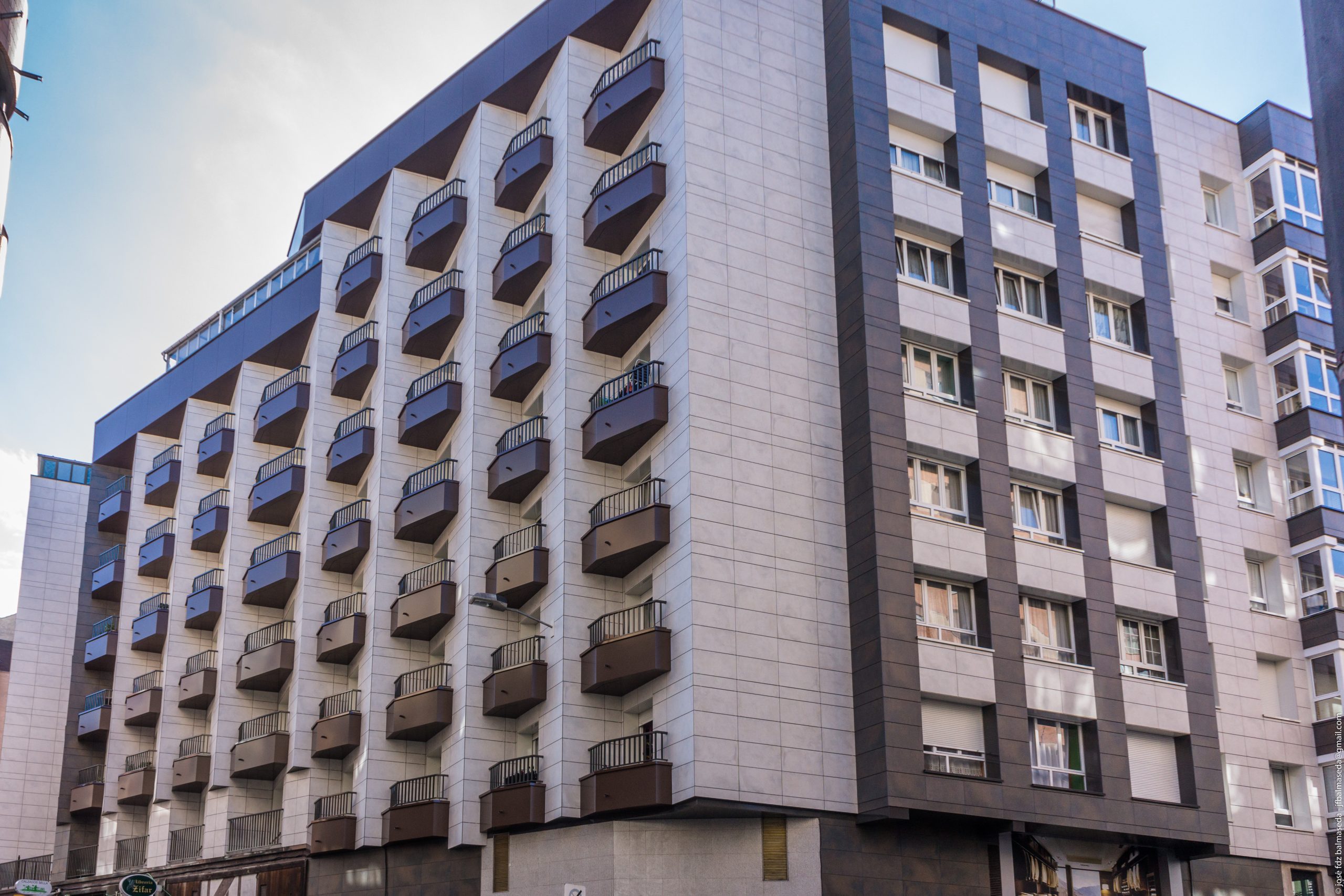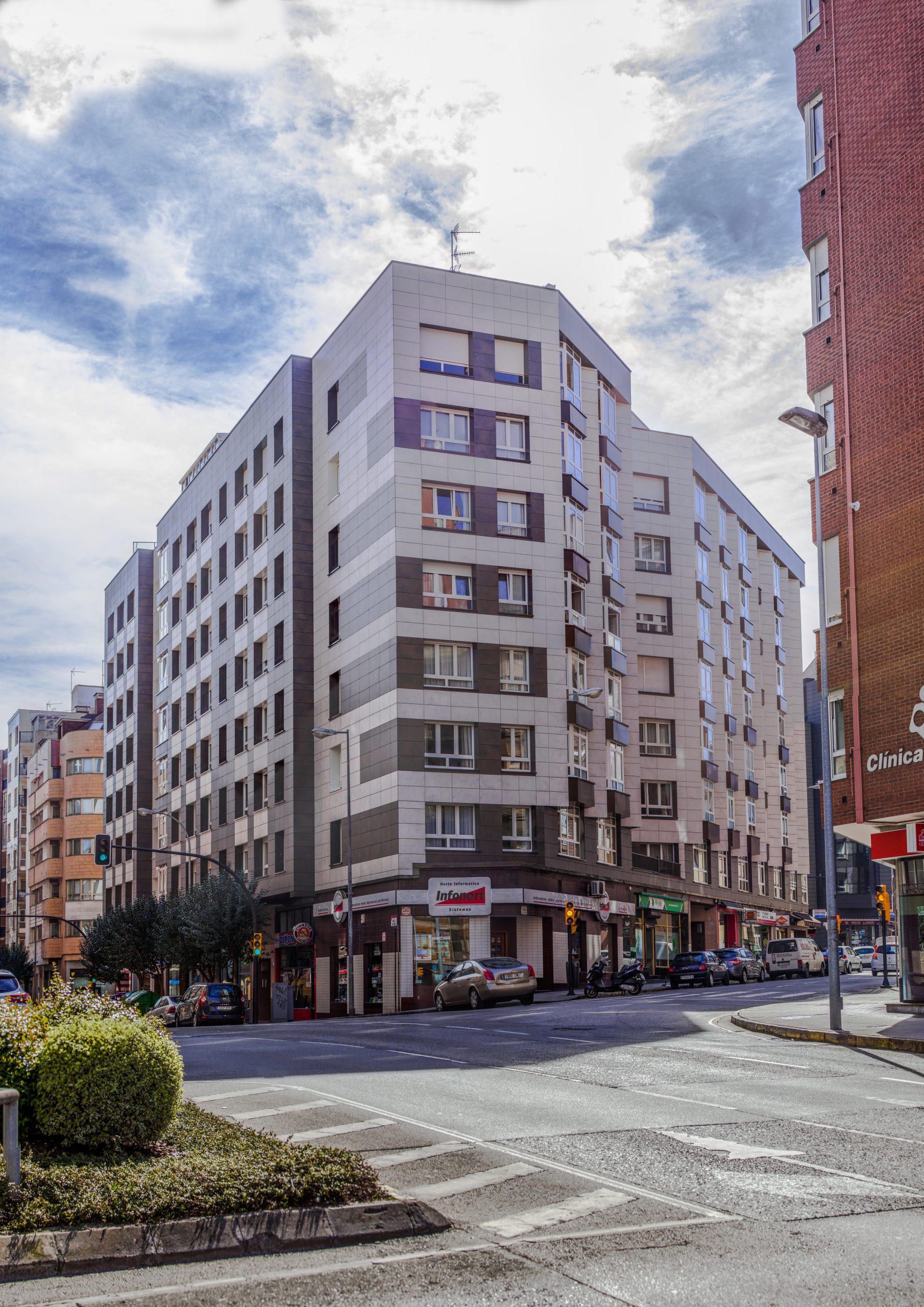 - Las fachadas se han aislado térmica y acústicamente mediante lana de roca, instalando un sistema de Fachada Ventilada con un acabado de gres porcelánico grapa vista que combina dos colores y entrepaños de panel composite.